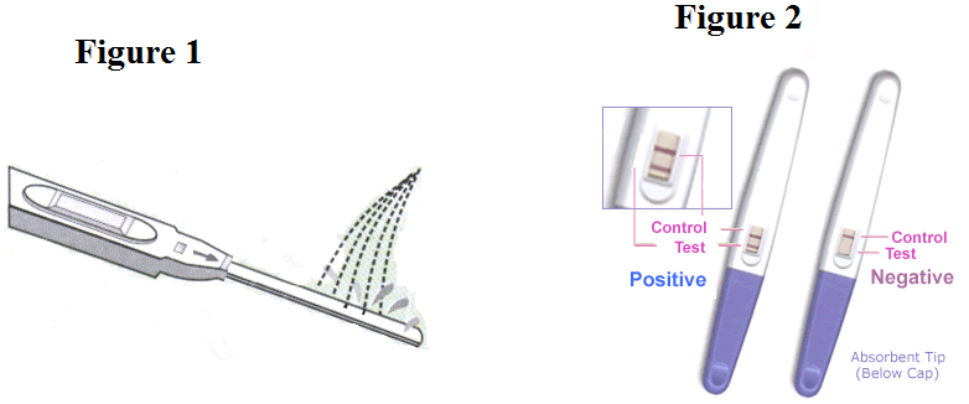 Het testreagens wordt blootgesteld aan urine, waardoor urine door de absorberende testcassette kan migreren. Het gelabelde antilichaam - kleurstofconjugaat bindt aan de HCG in het monster dat een antilichaam vormt - antigeencomplex. Dit complex bindt aan het anti - HCG -antilichaam in het testgebied (T) en produceert een rode lijn wanneer de HCG -concentratie gelijk is aan of groter dan 25 miU/ml. Bij afwezigheid van HCG is er geen lijn in het testgebied (T). Het reactiemengsel stroomt door het absorberende apparaat voorbij het testgebied (T) en het controlegebied (C). Niet -gebonden conjugaat bindt aan de reagentia in het controlegebied (C), waardoor een rode lijn wordt geproduceerd, wat aantoont dat de testcassette correct functioneert.